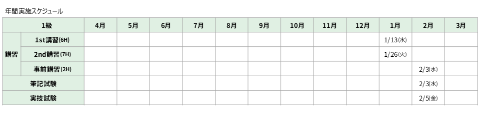 1級 講習 1月13日(水)・1月26日(火) / 事前・筆記試験 2月3日(水) / 実技試験 2月5日(金)