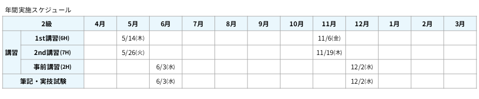 2級 講習 5月14日(木)・5月26日(火) / 事前・検定試験 6月3日(水)