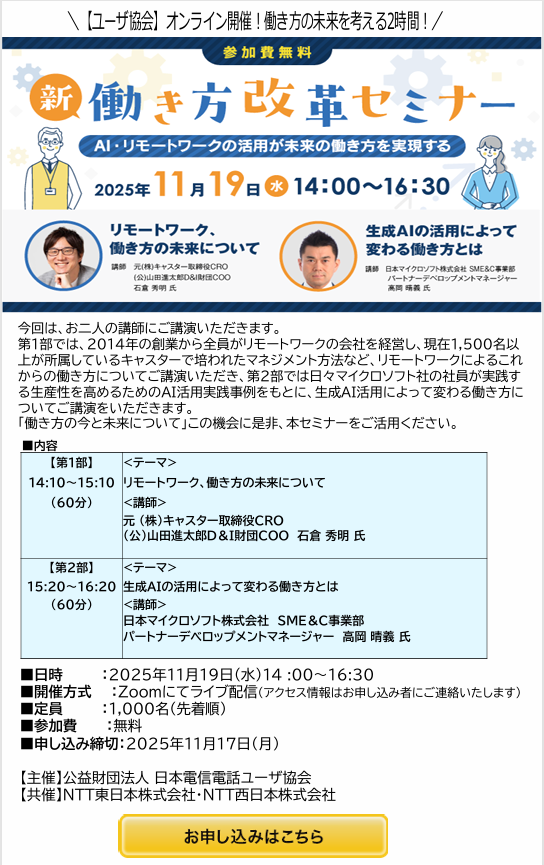 | 注意事項 | 1.1社20名様まで受講可能。(先着100社様限定) 2.ユーザ協会HPでお申込完了後、申込み責任者宛にユーザ協会事務局からメールにて受講者登録方法等ご連絡します。 |