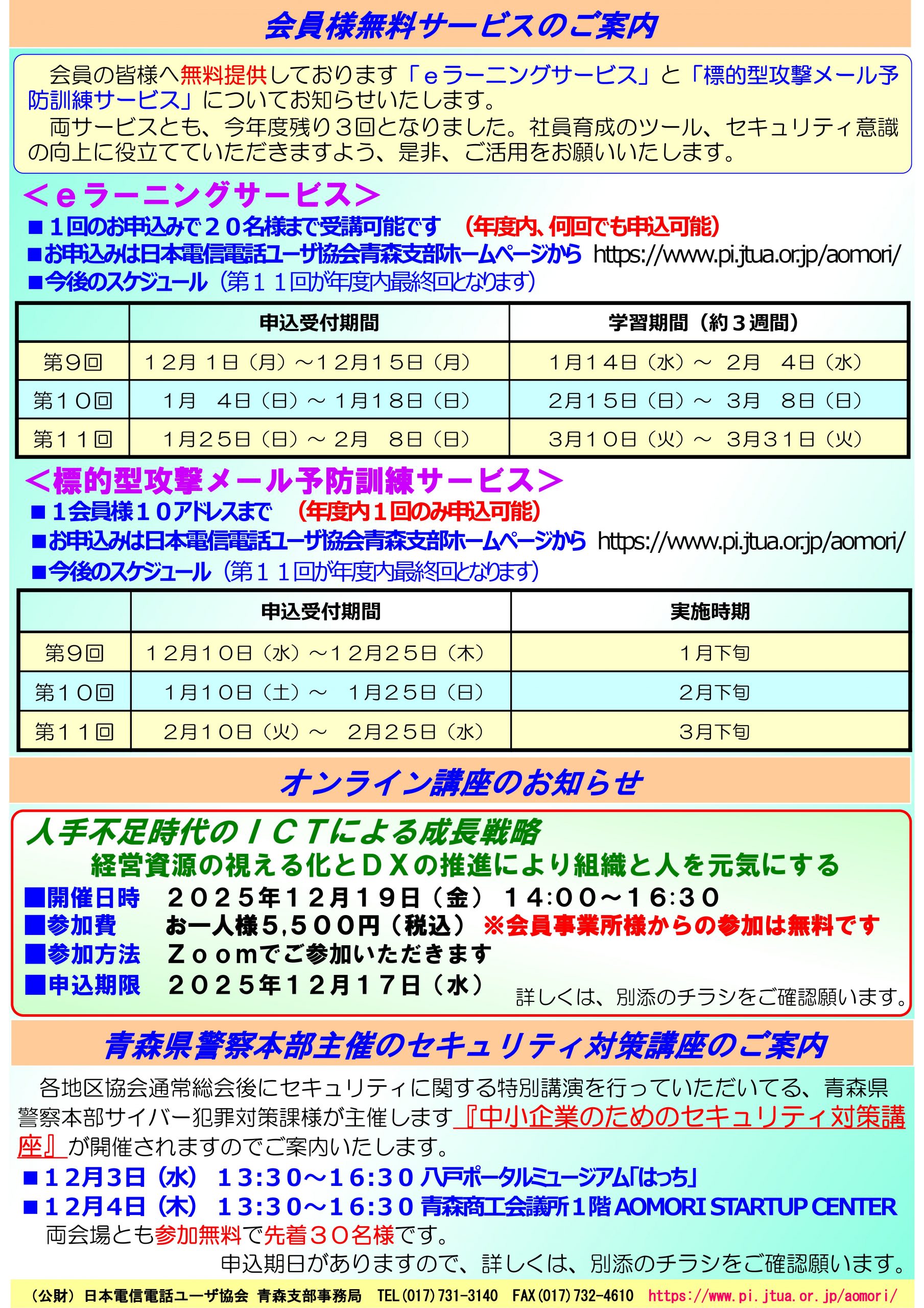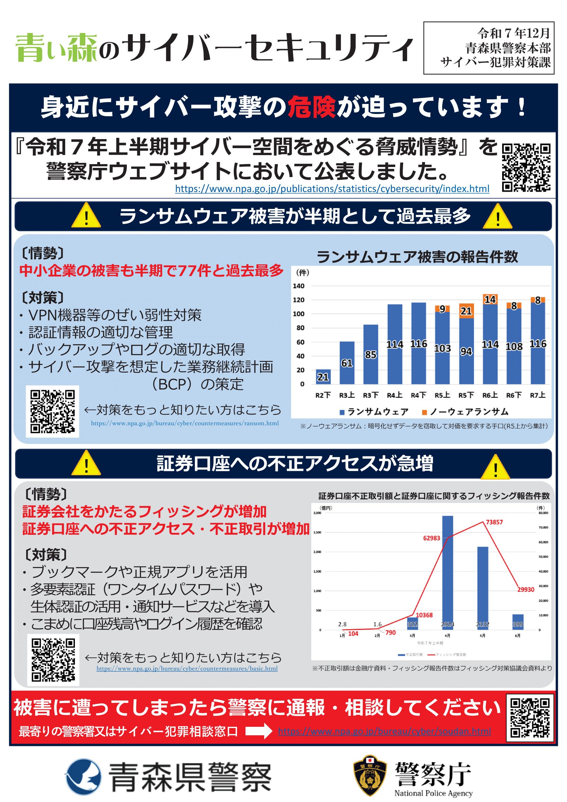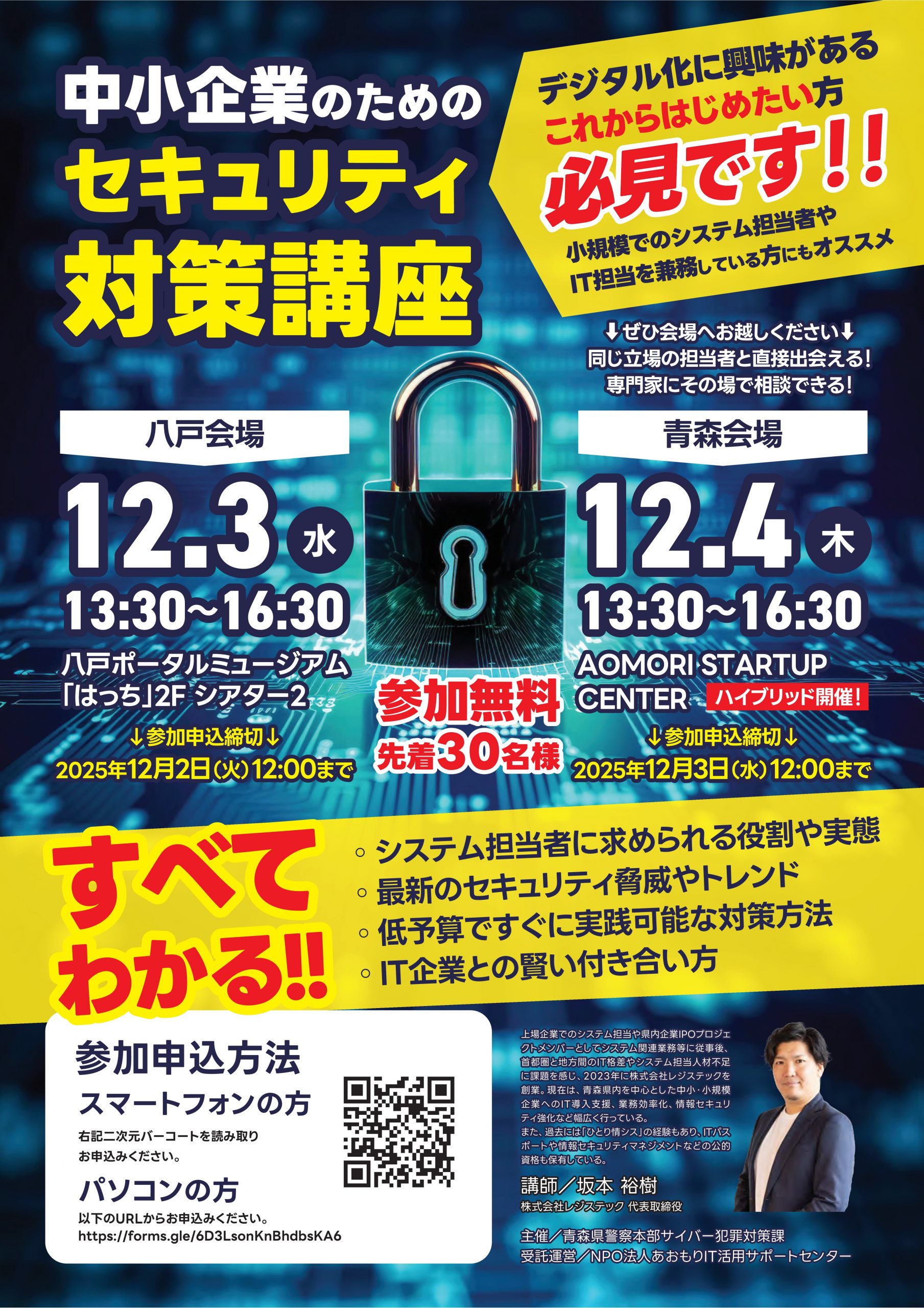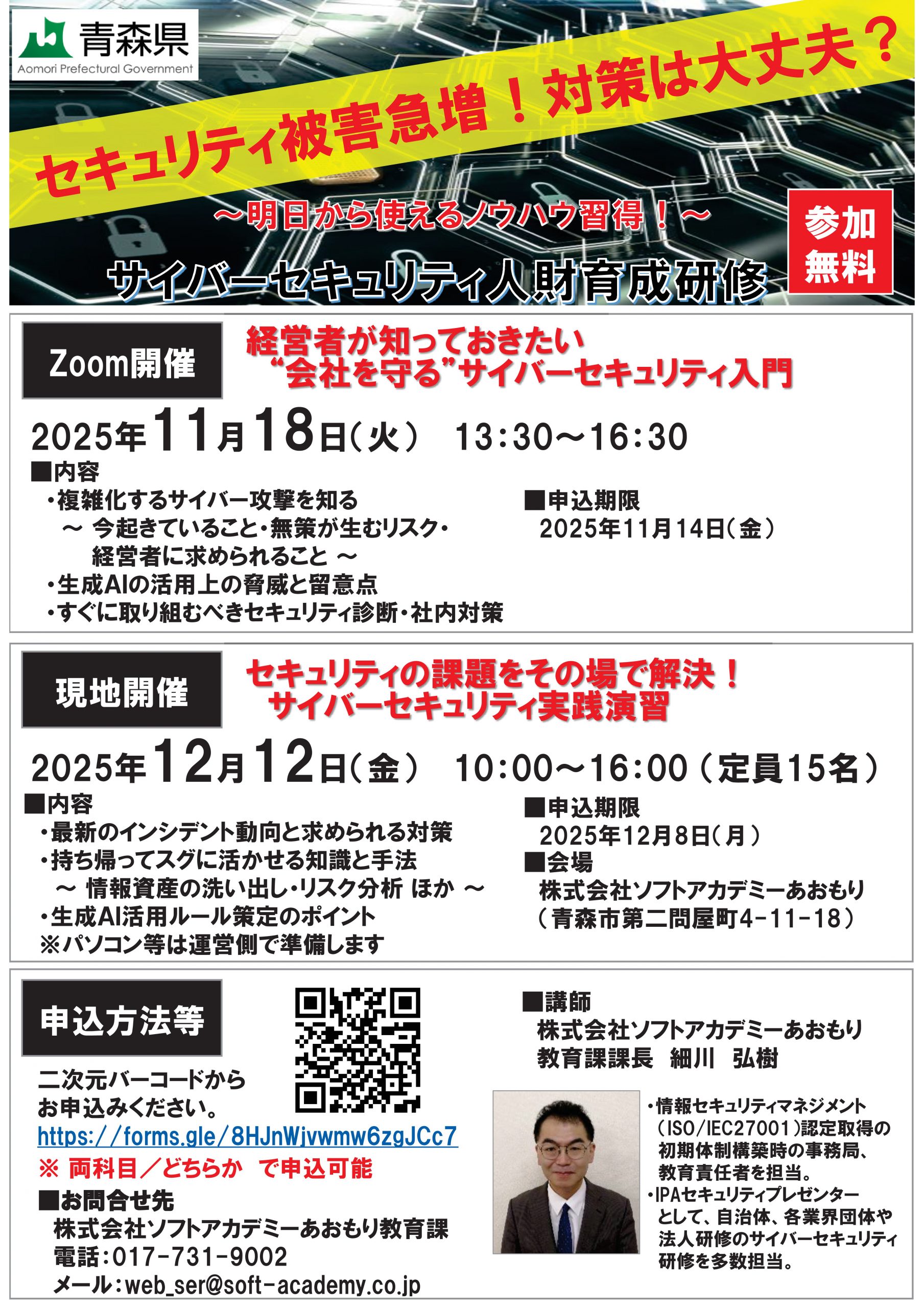 集合研修・オンラインセミナー 青森県警察 県警本部サイバー犯罪対策課主催 中小企業のためのセキュリティ対策講座 開催のご案内<参加無料>