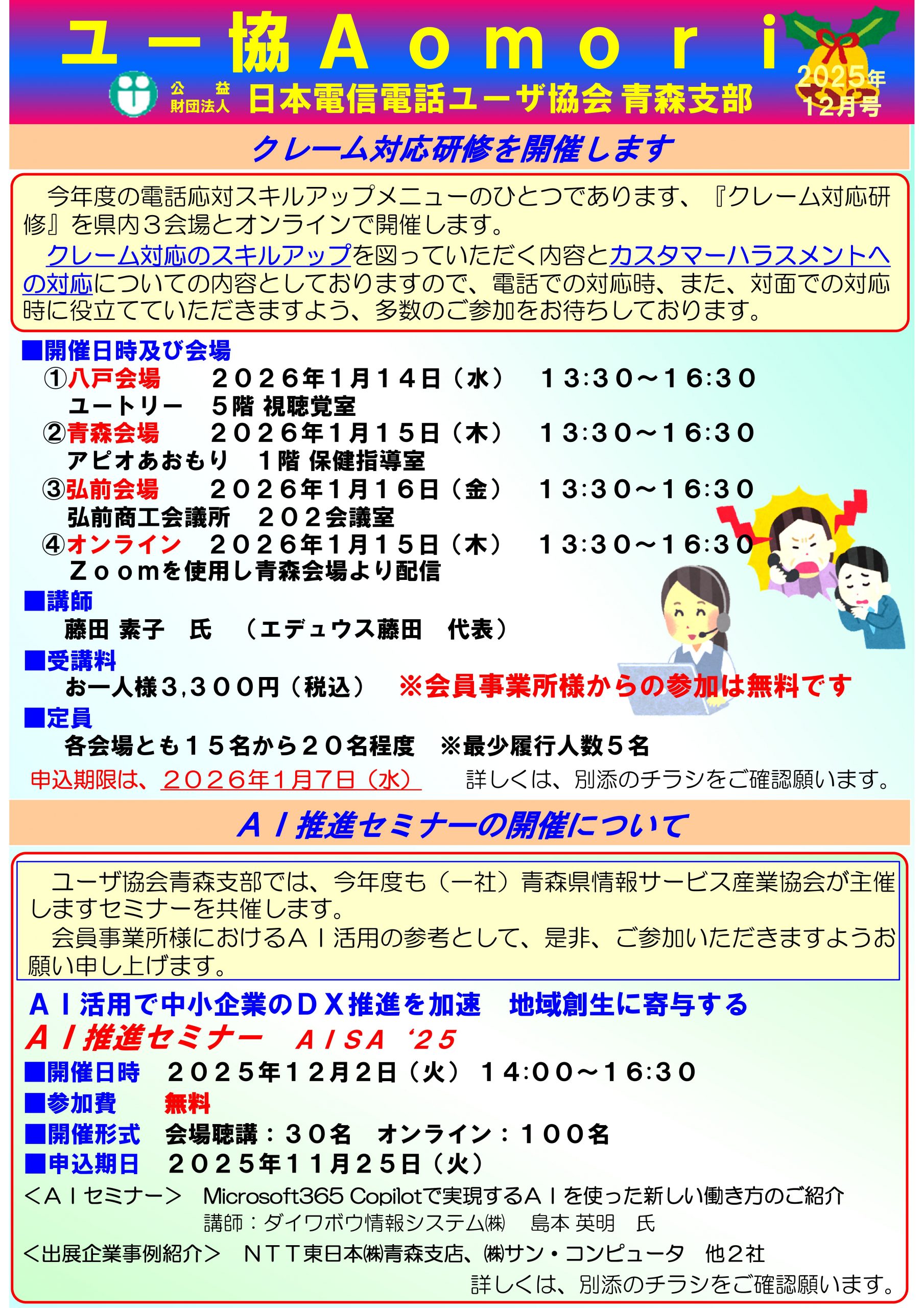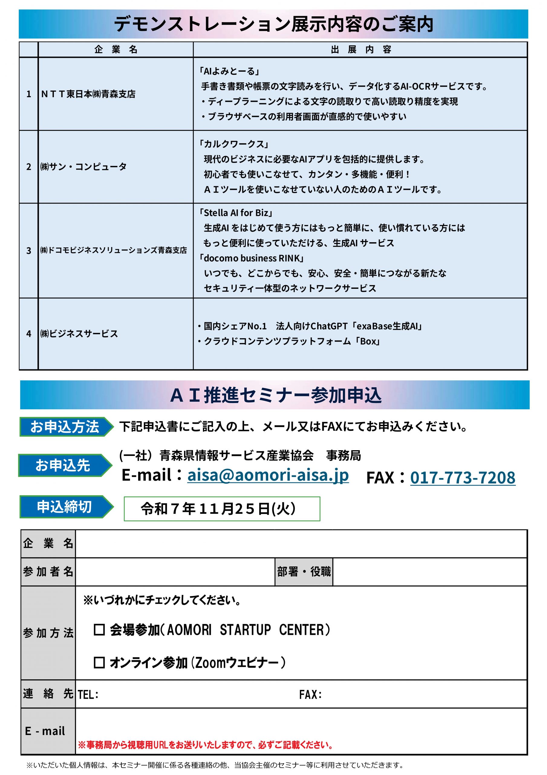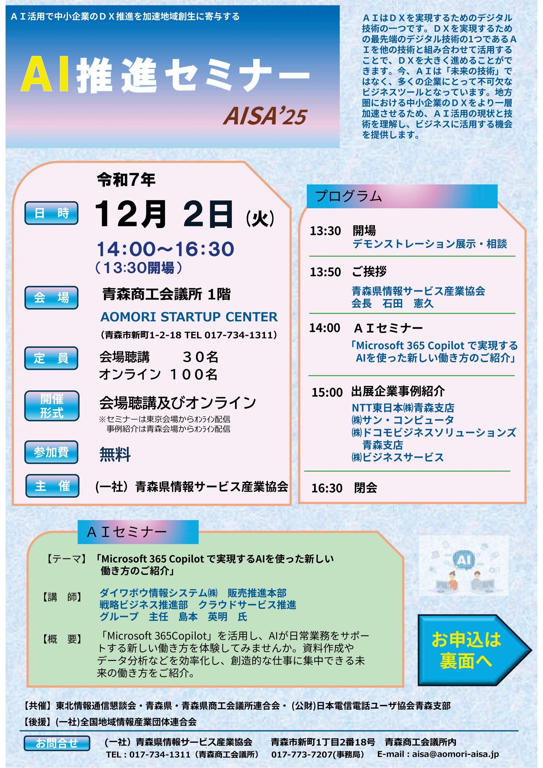 集合研修・オンラインセミナー (一社)青森県情報サービス産業協会主催 AI推進セミナーAISA’25 のご案内<参加費無料>
