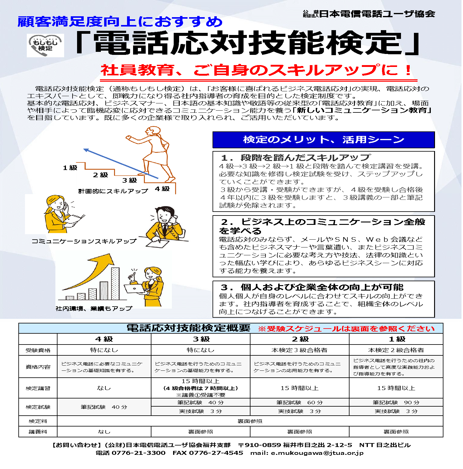 現在、「電話オペレータ」や「窓口」の業務に就いておられる方、「営業・販売」、「社員指導・マネジメント」を行う立場にある方、あるいは、これから社会への第一歩を踏み出す「新入社員」・「大学生」・「高校生」の皆さまにとって、自信をもって仕事と向き合うために、また更なる成長のガイド役として、「電話応対技能検定(もし検)」 はぴったりです。