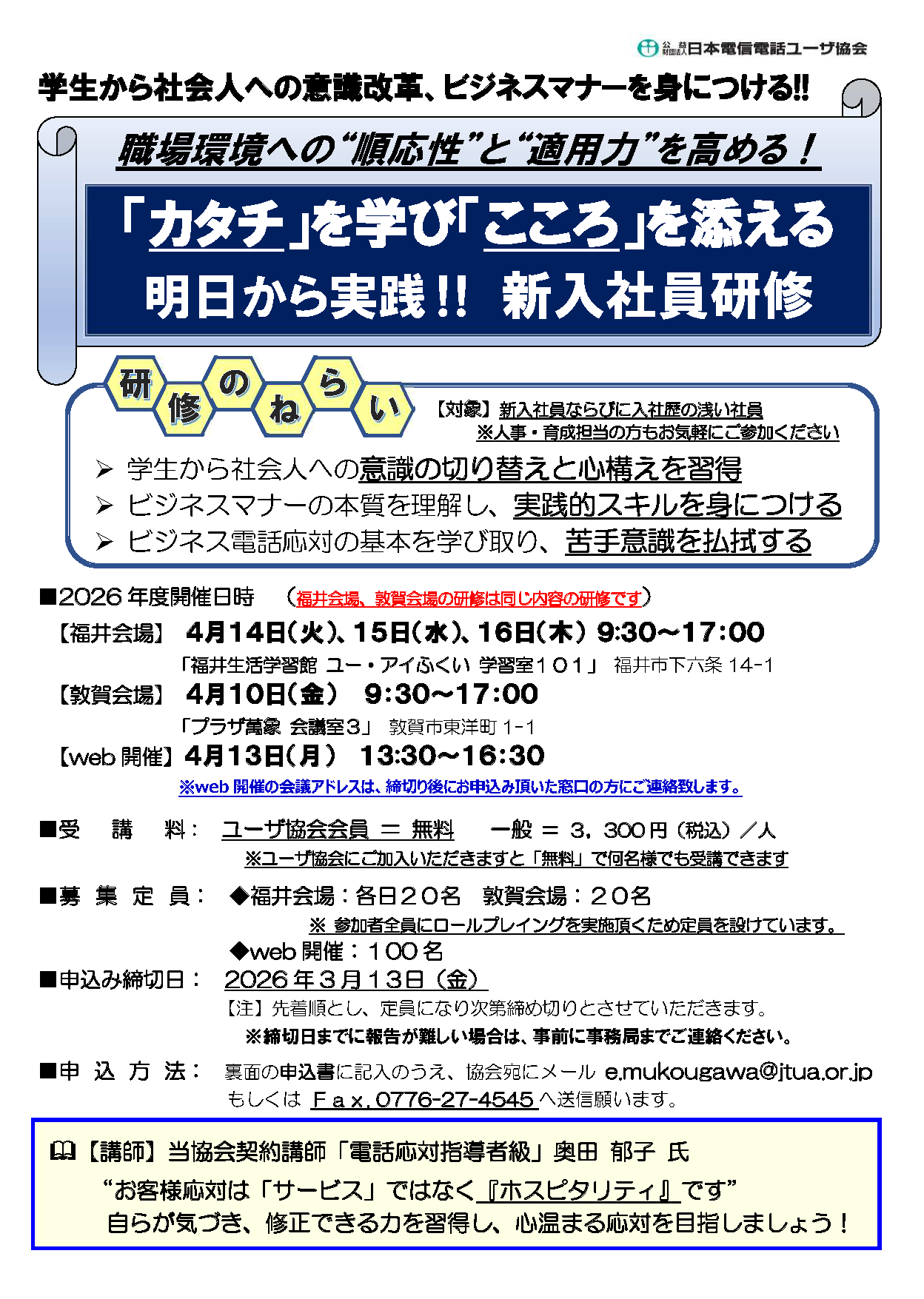 またこのほか協会では、新入社員や中堅社員のビジネスマナー研修も行っています。