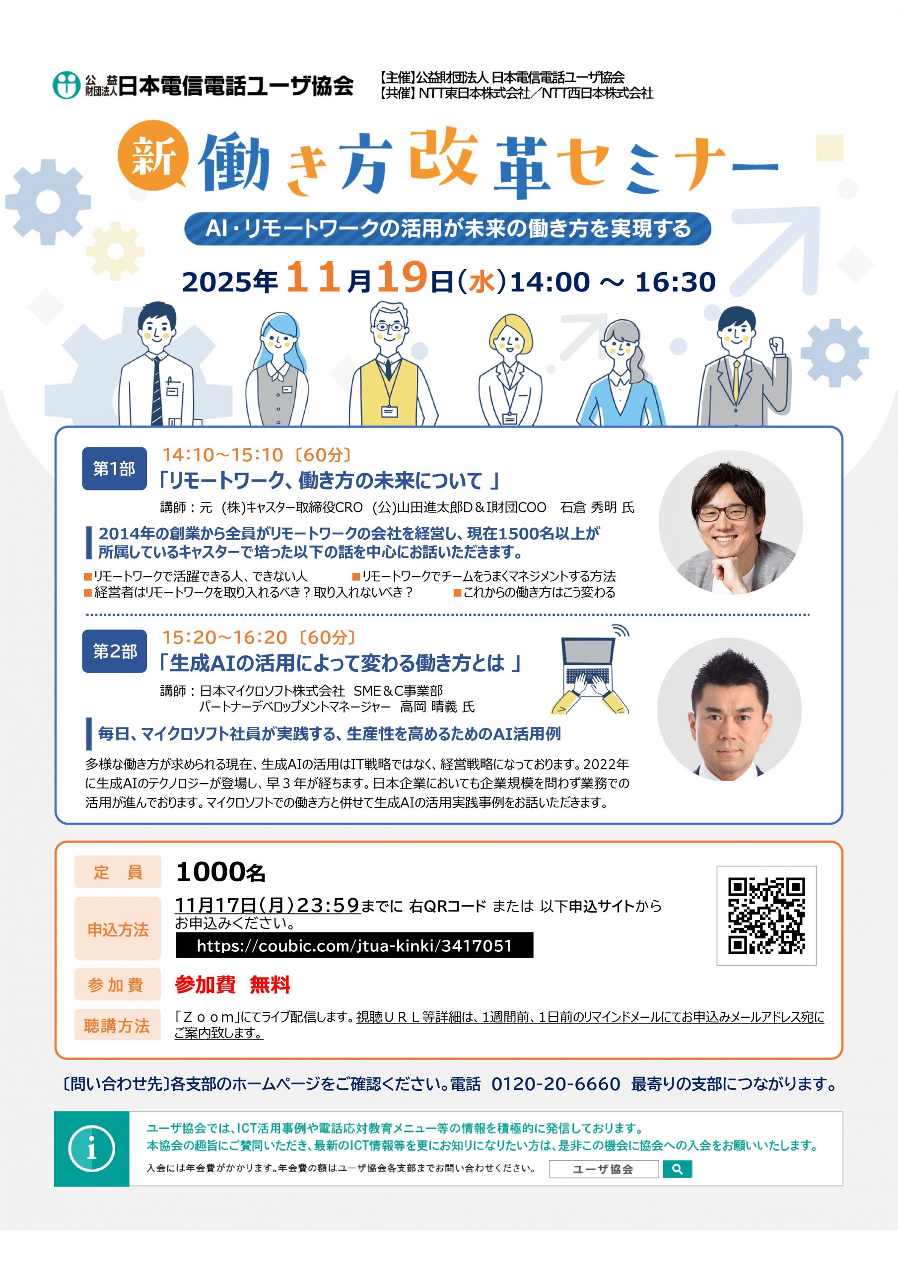 受付中!【11月19日開催】<オンラインセミナー>~働き方改革セミナー「AI・リモートワークの活用が未来の働き方を実現する」~ のご案内