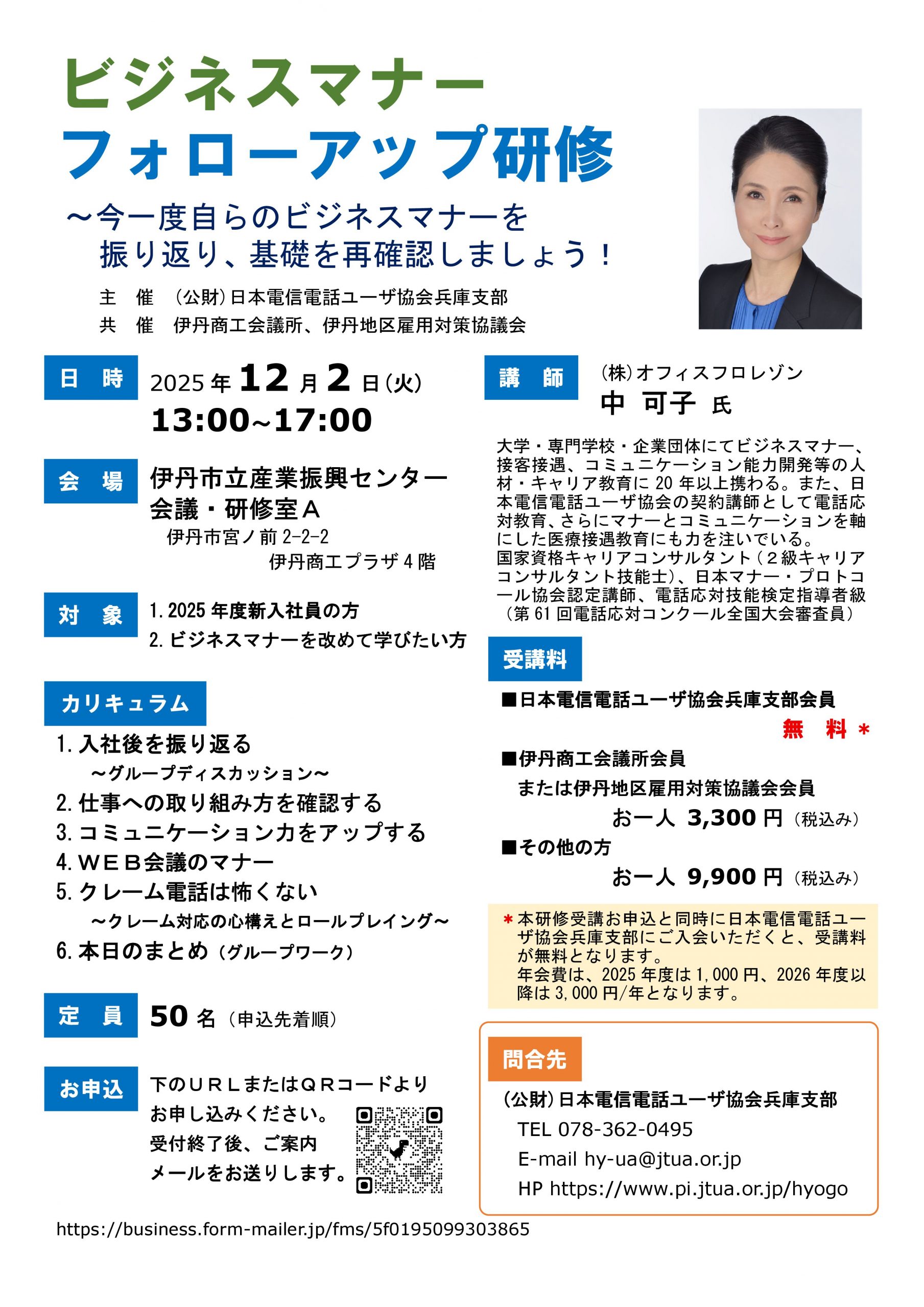 受付中!ビジネスマナーフォローアップ研修のご案内[伊丹商工会議所、伊丹地区雇用対策協議会 共催]