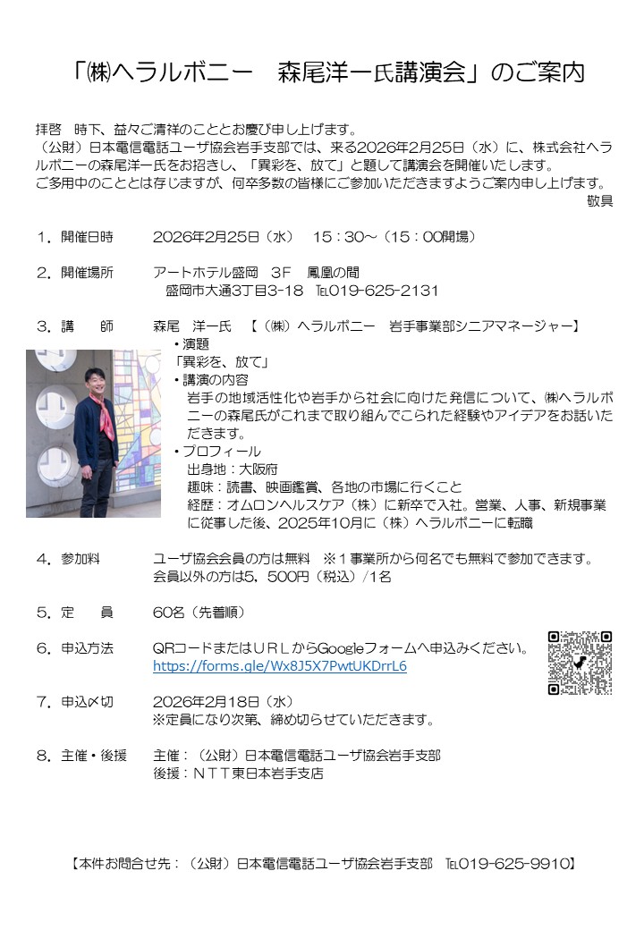 〒020-8558 盛岡市中央通1丁目5-1 NTT東日本 岩手支店内