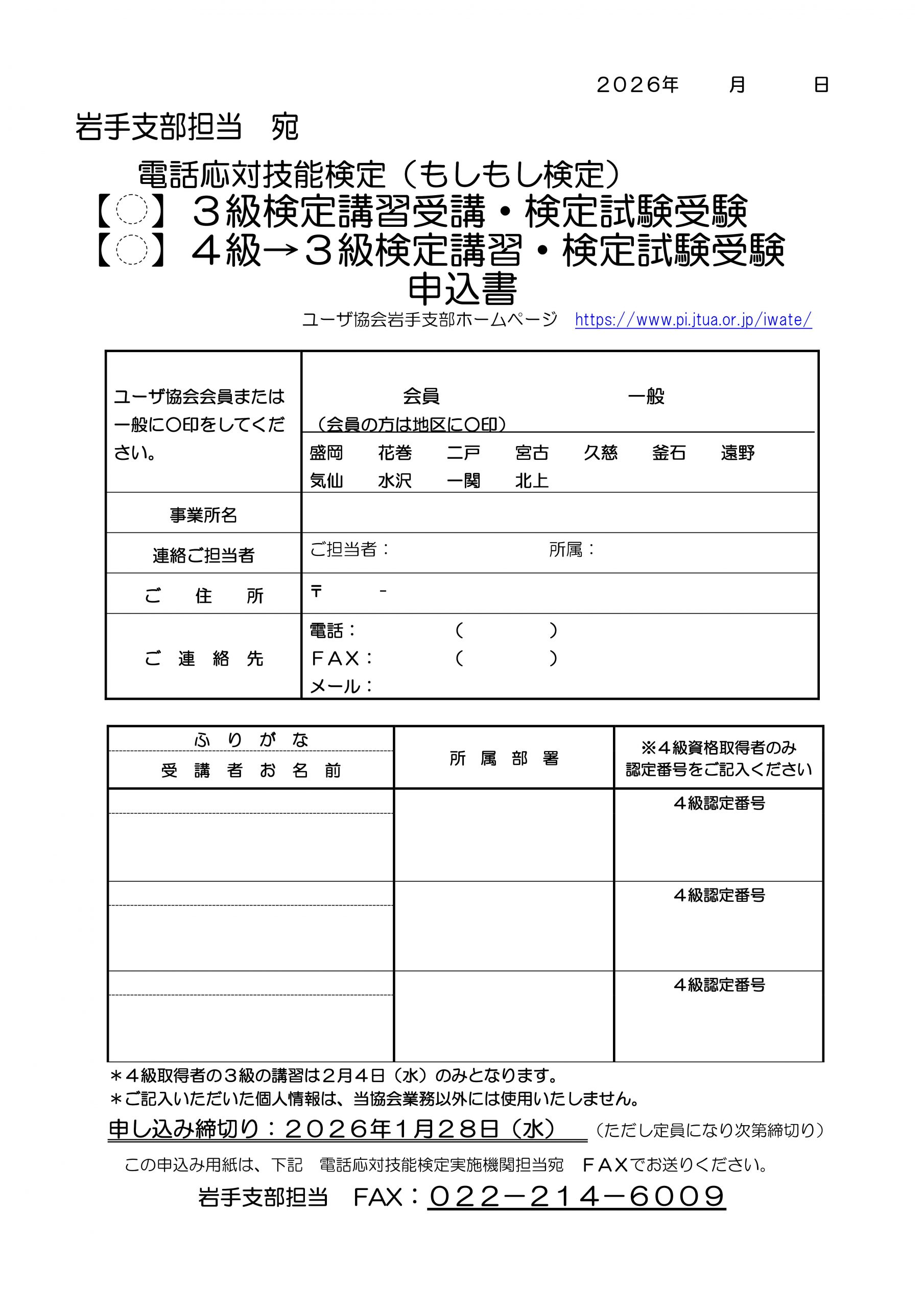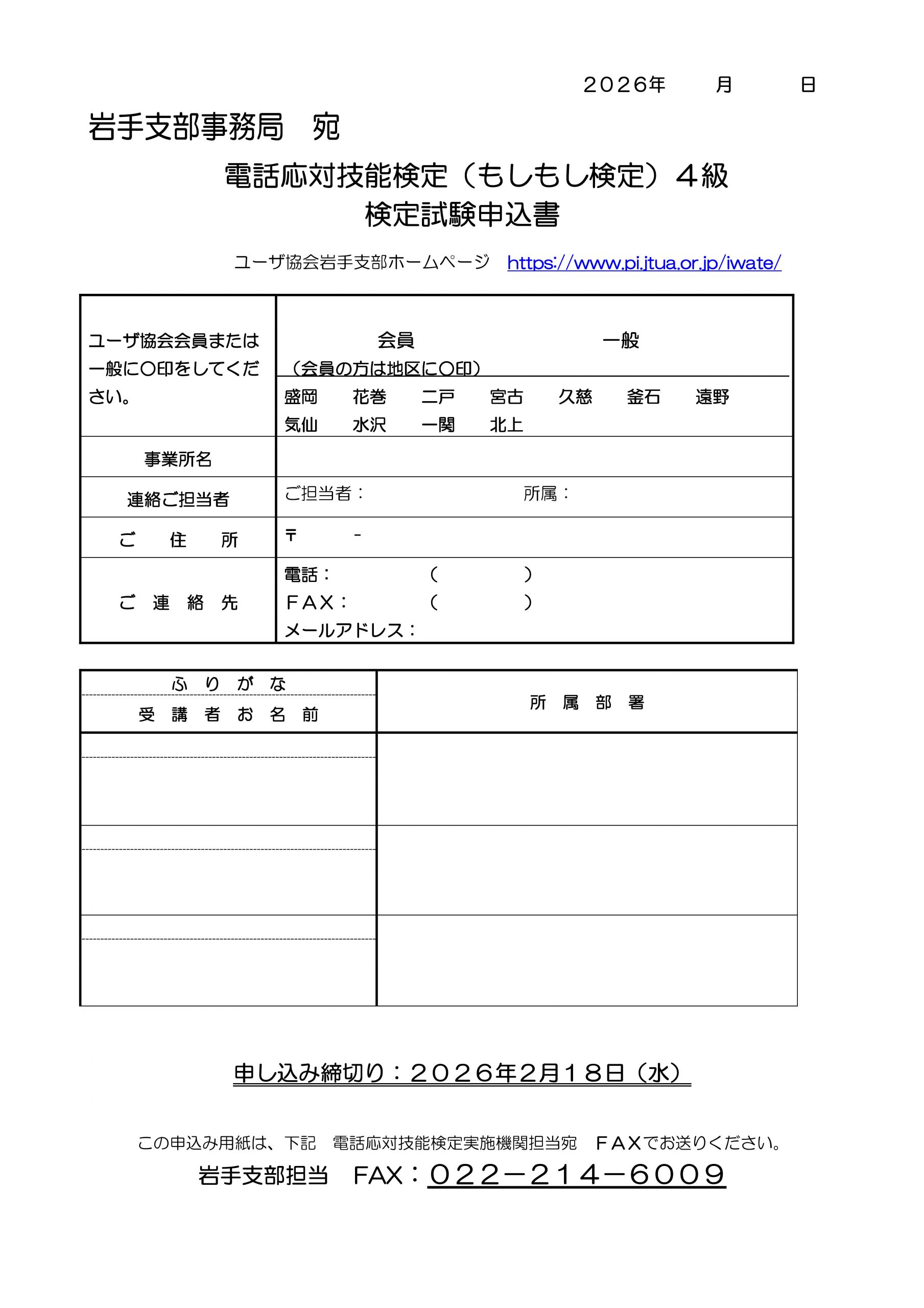 電話応対技能検定「もしもし検定」4級検定料の改定及び、