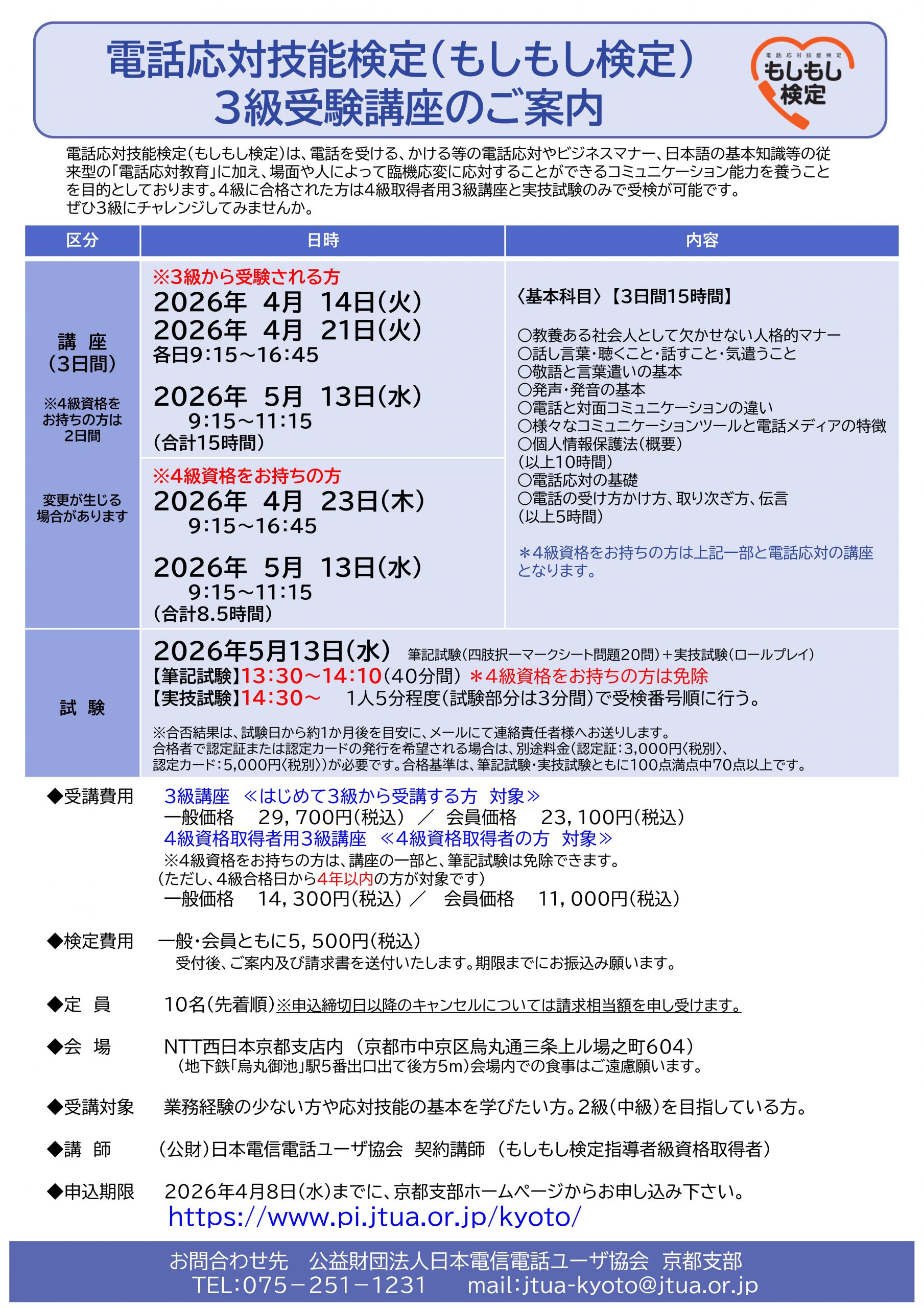 参 加 費 :1名 8,000円 <京都支部会員 1名 4,000円> (税・テキスト代込)