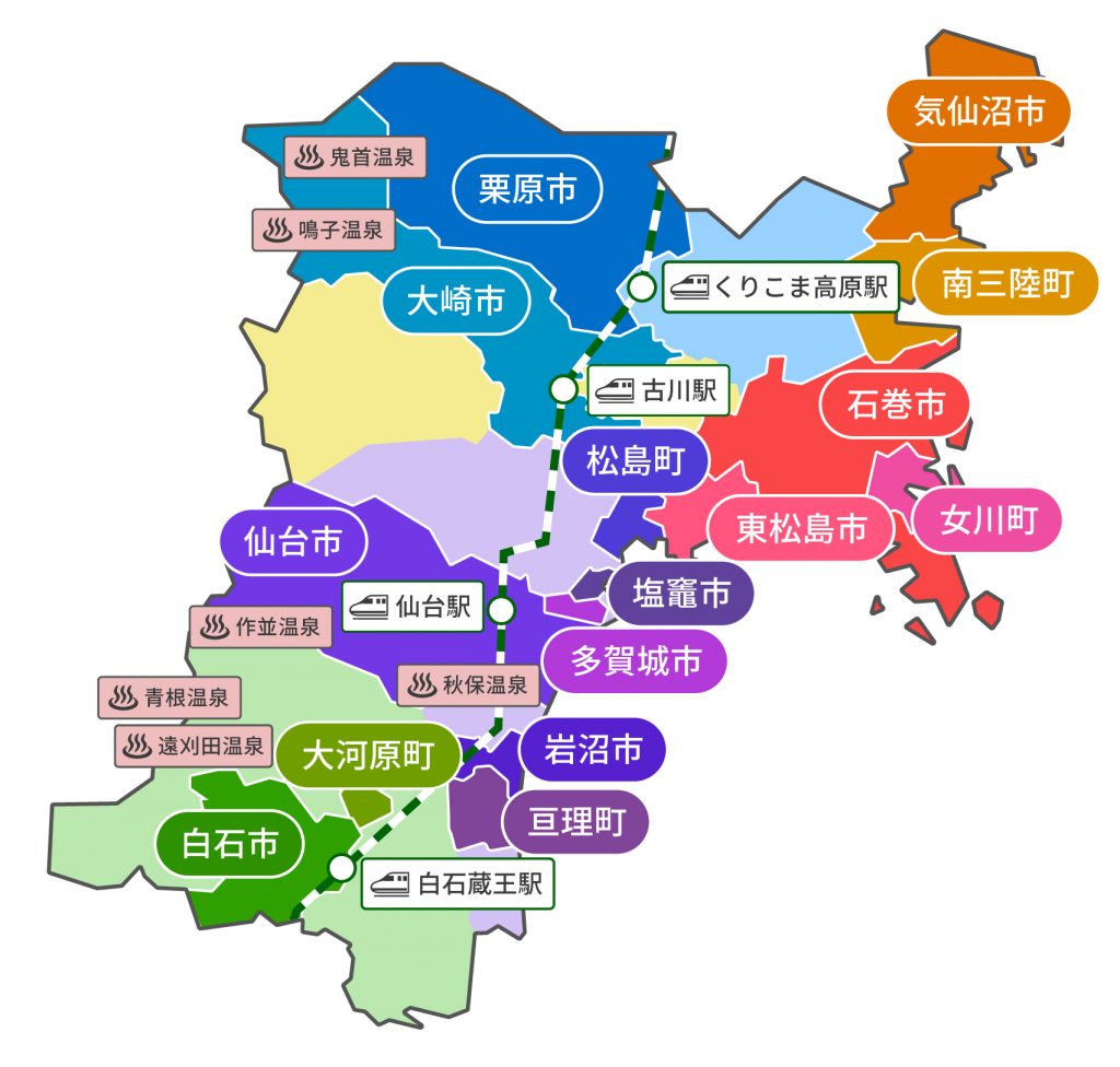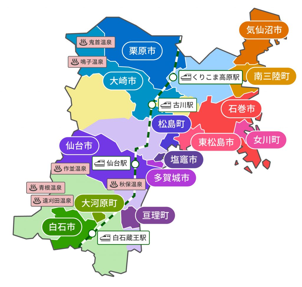 新幹線で「仙台駅」から北の「古川駅」までは13分程、「くりこま高原駅」まで25分程、岩手県の「一関駅」まで行っても35分程度で、南の「白石蔵王駅」まで14分程で行けます。