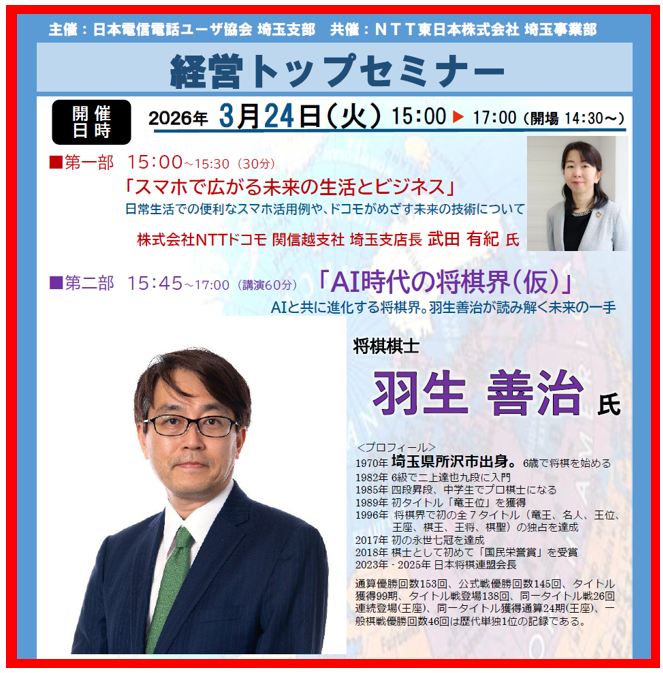 3月24日開催【経営トップセミナー】●羽生将棋士講演 「AI時代による将棋界」