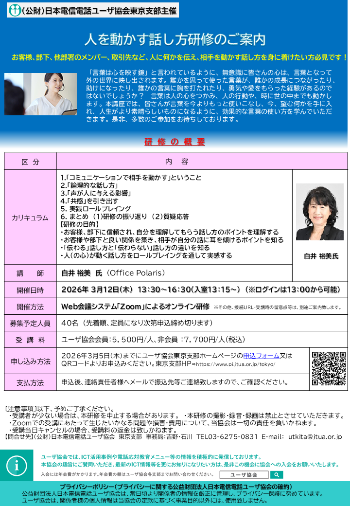 【受付中】3月12日開催 「人を動かす話し方研修」