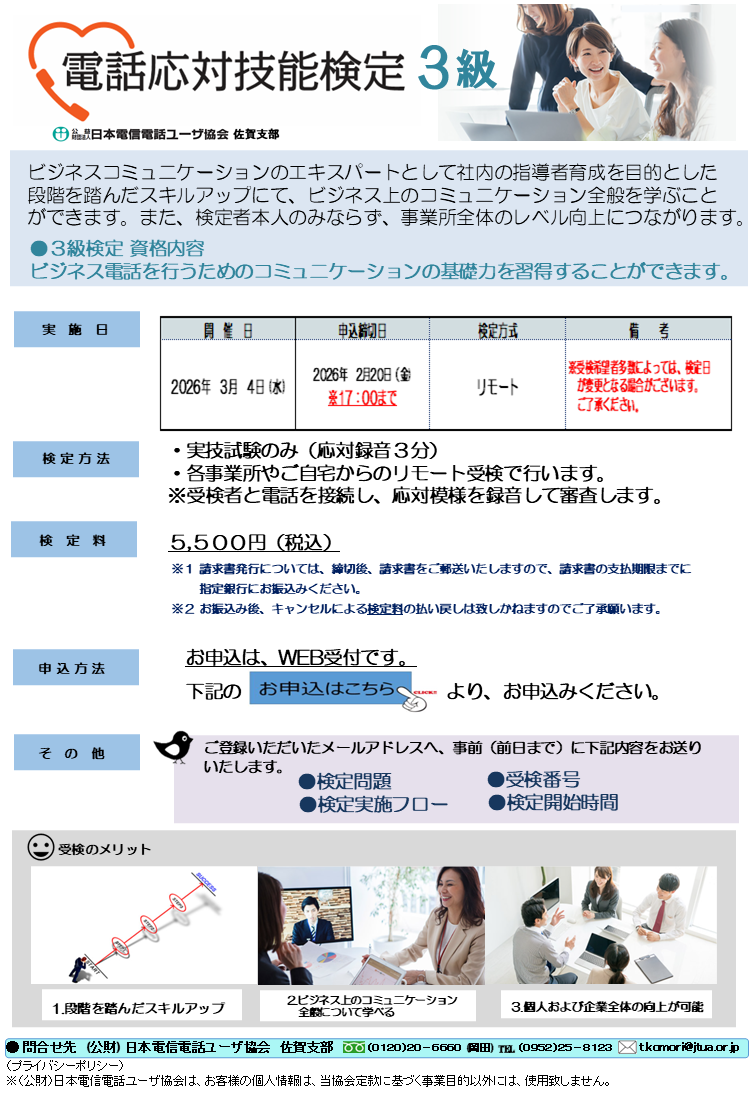 【受付中】3月4日開催 「電話応対技能検定3級」