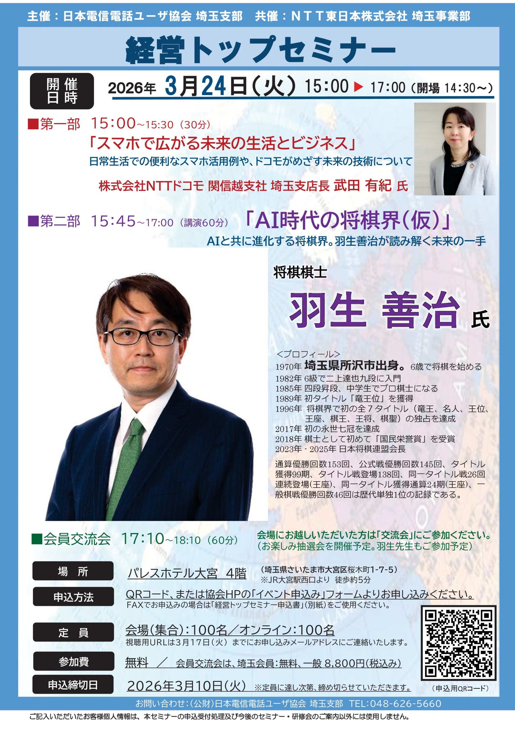 【受付中】3月24日開催【経営トップセミナー】●羽生将棋士講演 「AI時代による将棋界」