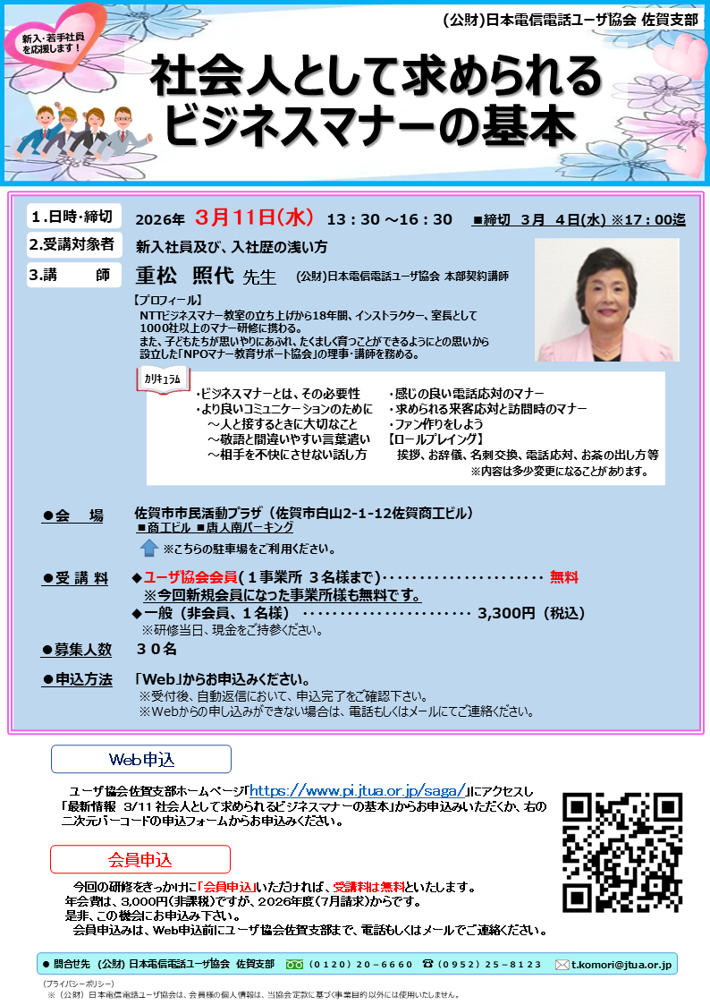 【受付中】3月11日「社会人として求められるビジネシスマナーの基本(佐賀)」
