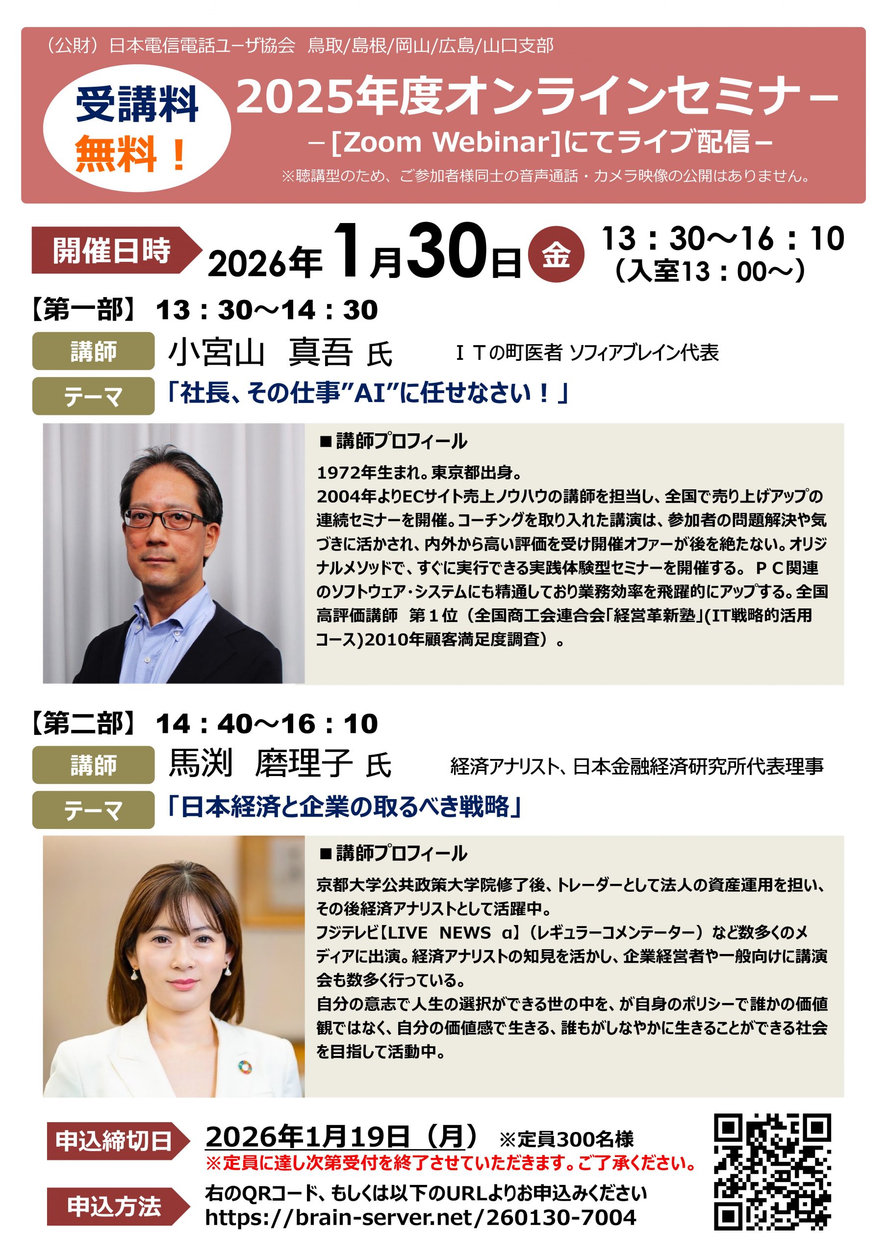 申込受付中!【1月30日開催】2025年度年オンラインセミナー〔第一部〕小宮山 真吾氏「社長、その仕事"AI"に任せなさい!」〔第二部〕馬渕 磨理子氏「日本経済と企業のとるべき戦略」