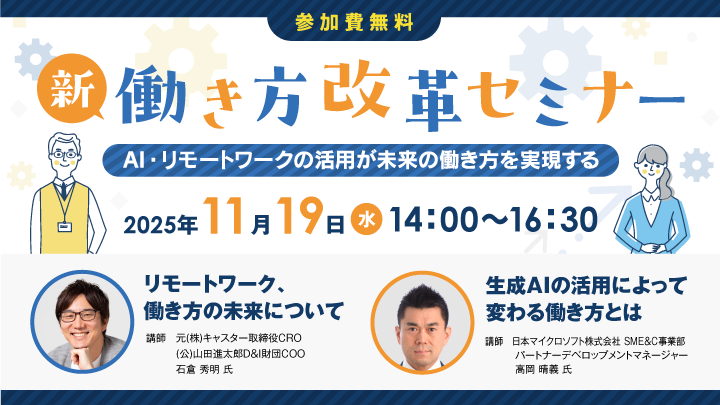 【全国参加型ICTオンラインセミナー】11月19日(水)「新働き方改革セミナー AI・リモートワークの活用が未来の働き方を実現する」のご案内