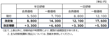 このため、各種研修の受講料については、以下のとおり、改定させていただくこととしました。