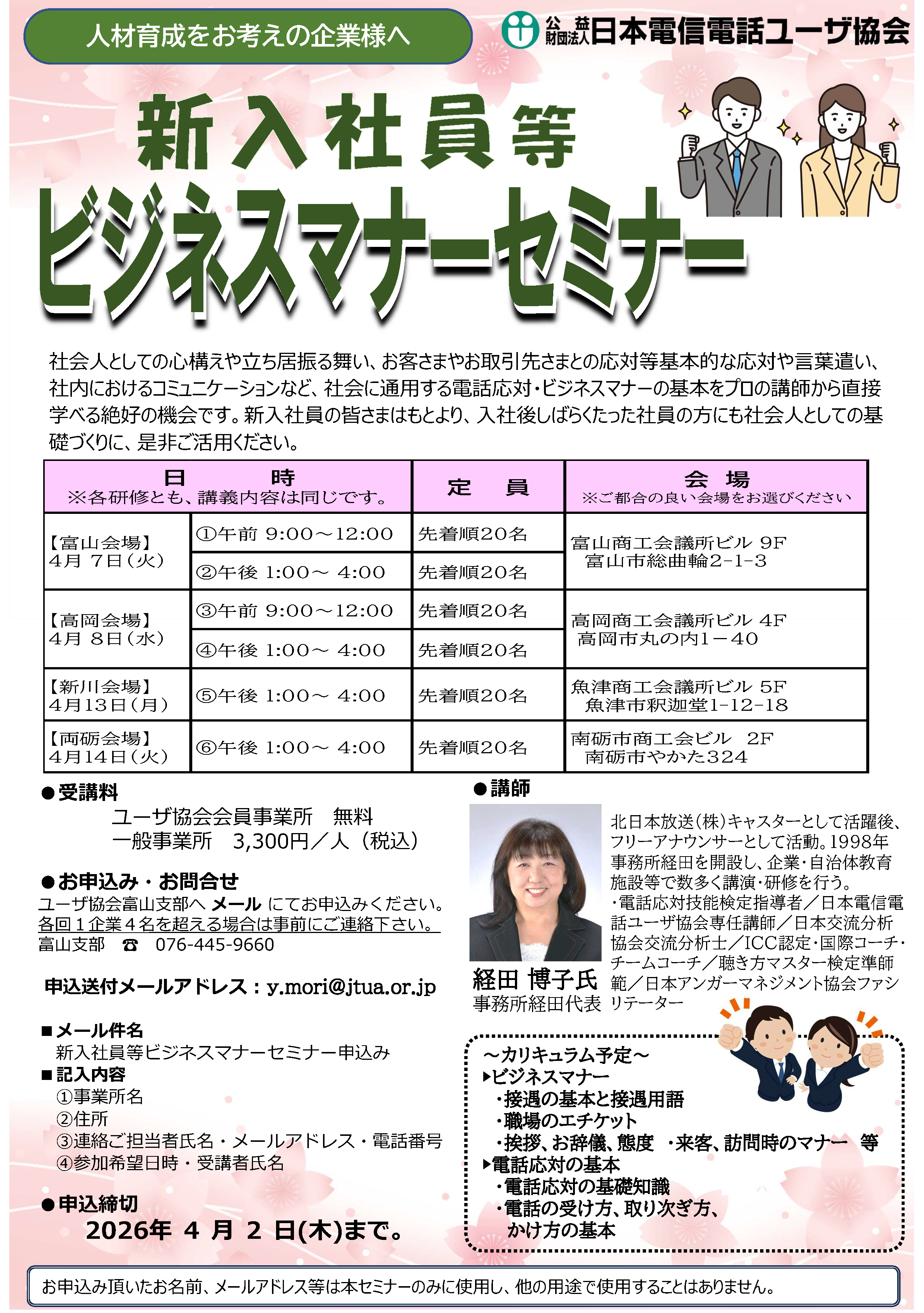 【お問合せ】ユーザ協会富山支部 電話:076-445-9660 メール:y.mori@jtua.or.jp フリーダイヤル:0120-206660